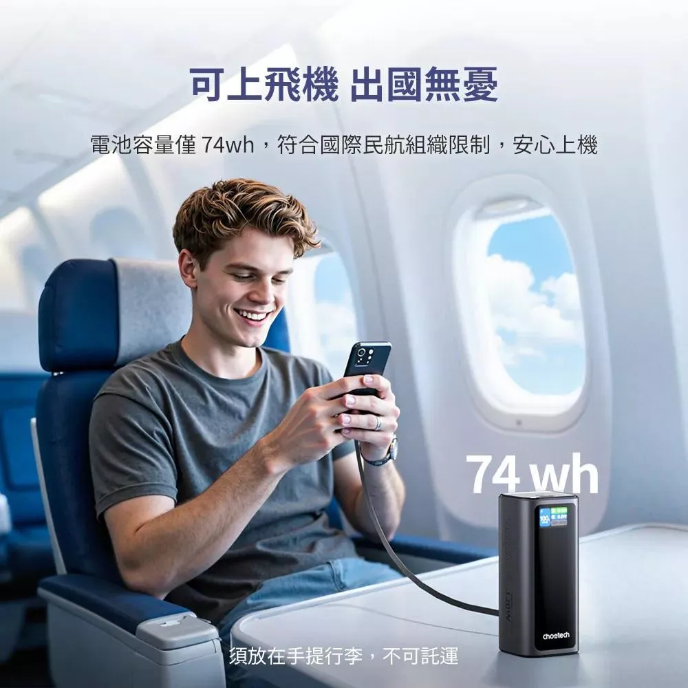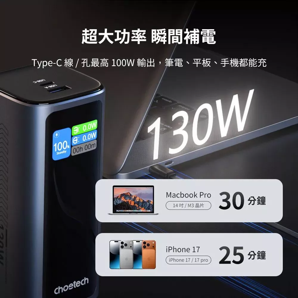 量批∥Choetech|狠能充 20000mAh PD130W 筆電快充自帶線行動電源 B815C 有CCC認證