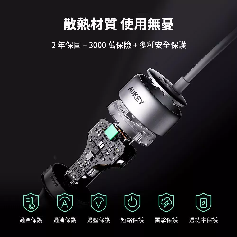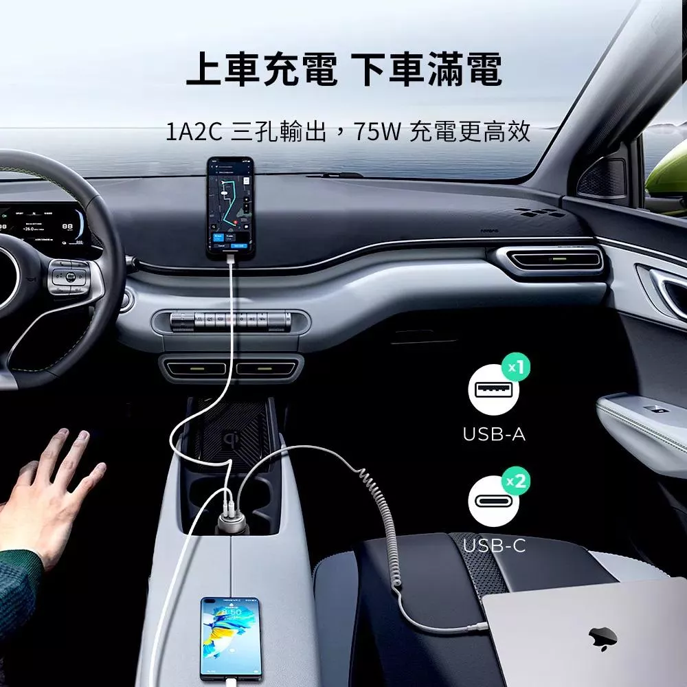 AUKEY|自帶線3孔75W PD快充車用充電器/點菸器